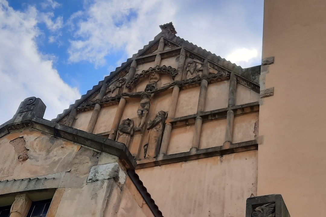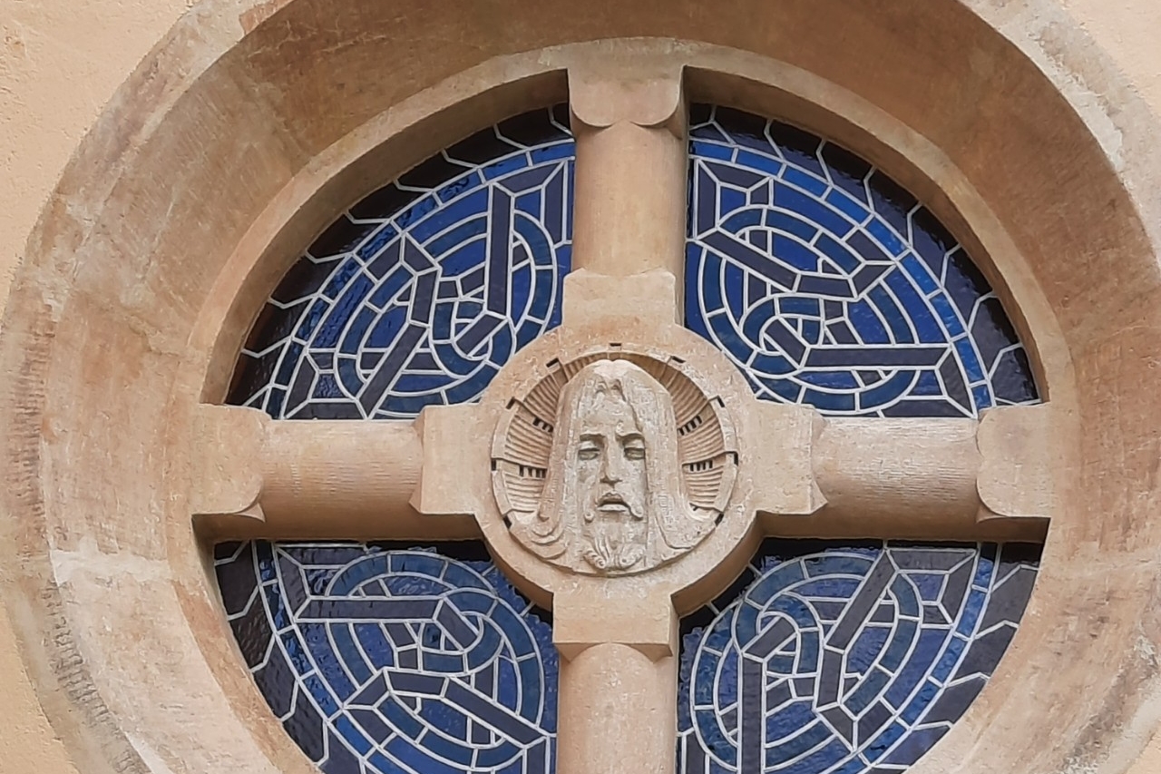 Fasáda zdobená četnými kamenickým detaily láká k bližšímu prozkoumání. Portál nám zdobí pískovcový reliéf s Janem Nepomuckým od Čeňka Vosmíka, nad ním ve štítu hlavní lodi vidíme Pietu s dvěma klečícími anděly od Vojtěcha Suchardy, který je autorem i dalších prvků. Naprosto úžasná je práce v detailech, kdy např. v rozetovém okně vidíme středověký kvadrilob pojatý však již secesně. Zábradlí 4 věžních oken nám zdobí symboly 4 evangelistů (anděl, býk, orel a lev) a nechybí ani nárožní chrliči. Původní 4 zvony byly roztaveny již během 1. světové války.