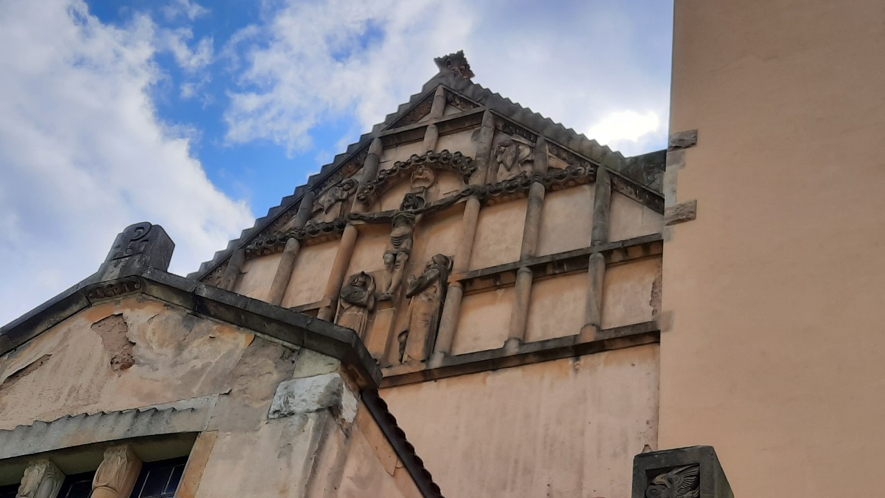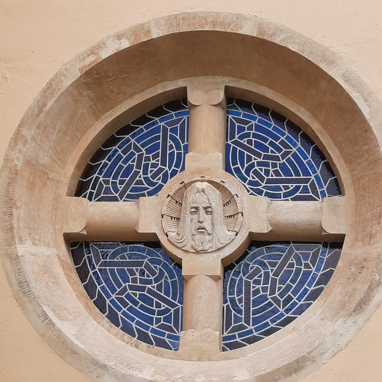 Fasáda zdobená četnými kamenickým detaily láká k bližšímu prozkoumání. Portál nám zdobí pískovcový reliéf s Janem Nepomuckým od Čeňka Vosmíka, nad ním ve štítu hlavní lodi vidíme Pietu s dvěma klečícími anděly od Vojtěcha Suchardy, který je autorem i dalších prvků. Naprosto úžasná je práce v detailech, kdy např. v rozetovém okně vidíme středověký kvadrilob pojatý však již secesně. Zábradlí 4 věžních oken nám zdobí symboly 4 evangelistů (anděl, býk, orel a lev) a nechybí ani nárožní chrliči. Původní 4 zvony byly roztaveny již během 1. světové války.