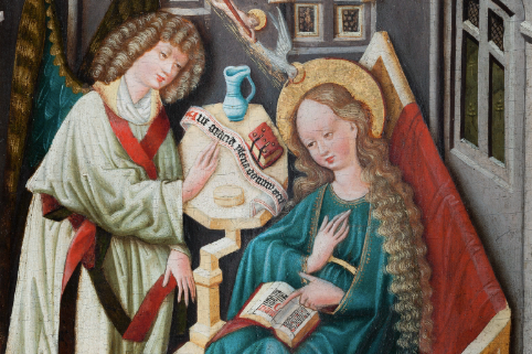 Nemohu nevzpomenout na Zvěstování od Mistra Vyšebrodského oltáře, které se řadí k tomu nejlepšímu i v evropském kontextu. Klasická scéna je obohacena o motiv rosy kanoucí z oblaku, ve kterém vidíme Boha Otce. Dle některých badatelů může jít o manu (symbol Kristovy inkarnace). Rosa jako symbol neposkvrněnosti dopadá na rozpraskanou zemi, kterou zavlažuje až nám z ní vyrůstá symbol čistoty (lilie). Jako další flóra je zobrazen stromek s dvojitým kmínkem, který může být aluzí na rajské stromy (strom života a strom poznání dobrého/zlého) či na dvojí inkarnaci Krista jako Boha i člověka. Páv je zde jako symbol věčnosti. Otevřená truhlička s poklady (kdo hledá, ten najde :-)) značí, že Panna neshromažďuje poklady na zemi ale v nebi. Modrá drapérie se zlatou lilií, do které je Gabriel oděn, není asi náhodná. Může odkazovat na heraldiku francouzských panovníků z rodu Valois či na svatební plášť Blanky z Valois (první manželka Karla IV.).