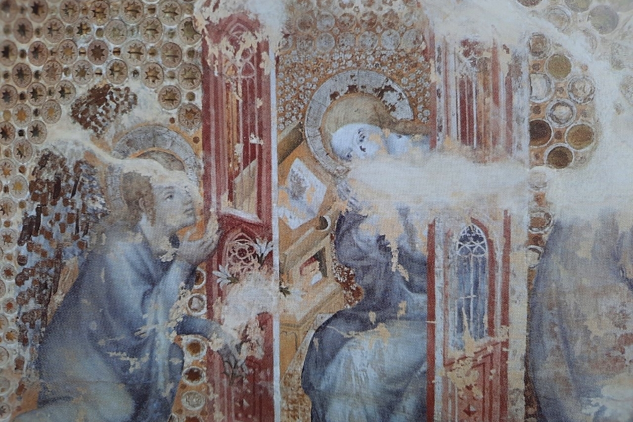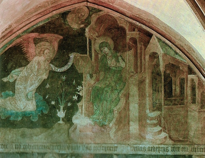 Jako díla české provenience jsme vybrali nástěnnou malbu z Emauzského kláštera, který byl založen císařem Karlem IV. a kam jste s námi mohli zavítat. Detaily jsou hůře čitelné díky staletím, kdy na malby působilo klima (ambit byl původně otevřený) a zkázu dokonal nálet z února 1945, kdy jedna z bomb dopadla přímo do rajského dvora. Zvěstování je jedno z nejzachovalejších polí rozsáhlého cyklu lidské spásy. V levé části vidíme archanděla Gabriela, který právě přilétl na obláčku. Pronesený pozdrav se tentokrát nachází na bílé pásce. Panna Marie sedí na trůnové architektuře a je opět vyrušena z četby. Kubínová zmiňuje, že architektura této scény pracovala se světlem/stínem přicházejícími do ambitu, které pomohlo trůn prostorově modelovat. Detaily tváře Bohorodičky jsou hůře čitelné, ale vidíme krásné gesto údivu rukou. Nechybí tu pověstná váza lilií ani Bůh Otec, kterého vidíme v horní části pole.