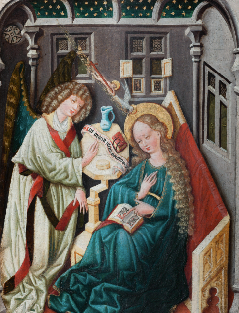 Nemohu nevzpomenout na Zvěstování od Mistra Vyšebrodského oltáře, které se řadí k tomu nejlepšímu i v evropském kontextu. Klasická scéna je obohacena o motiv rosy kanoucí z oblaku, ve kterém vidíme Boha Otce. Dle některých badatelů může jít o manu (symbol Kristovy inkarnace). Rosa jako symbol neposkvrněnosti dopadá na rozpraskanou zemi, kterou zavlažuje až nám z ní vyrůstá symbol čistoty (lilie). Jako další flóra je zobrazen stromek s dvojitým kmínkem, který může být aluzí na rajské stromy (strom života a strom poznání dobrého/zlého) či na dvojí inkarnaci Krista jako Boha i člověka. Páv je zde jako symbol věčnosti. Otevřená truhlička s poklady (kdo hledá, ten najde :-)) značí, že Panna neshromažďuje poklady na zemi ale v nebi. Modrá drapérie se zlatou lilií, do které je Gabriel oděn, není asi náhodná. Může odkazovat na heraldiku francouzských panovníků z rodu Valois či na svatební plášť Blanky z Valois (první manželka Karla IV.).