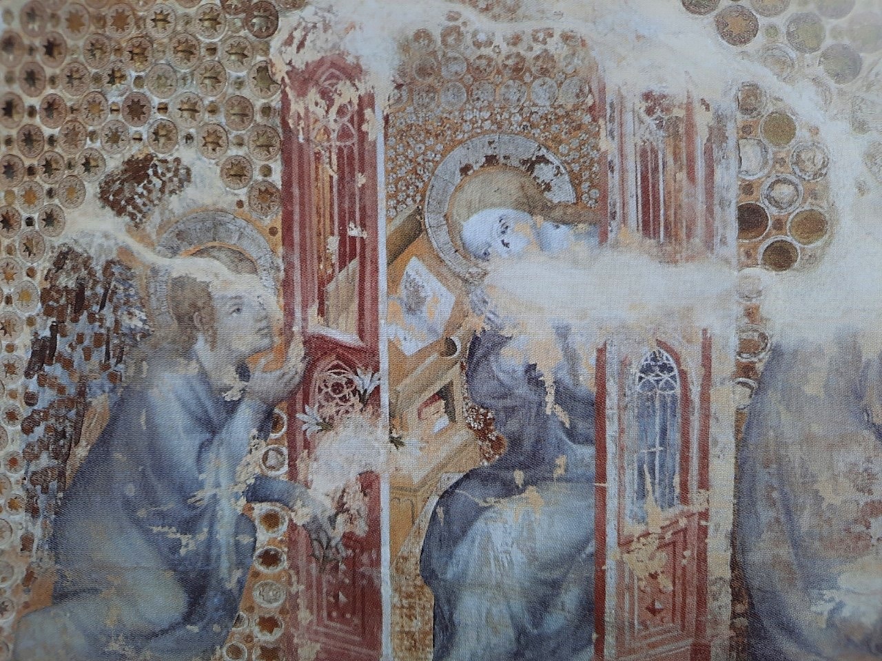Jako díla české provenience jsme vybrali nástěnnou malbu z Emauzského kláštera, který byl založen císařem Karlem IV. a kam jste s námi mohli zavítat. Detaily jsou hůře čitelné díky staletím, kdy na malby působilo klima (ambit byl původně otevřený) a zkázu dokonal nálet z února 1945, kdy jedna z bomb dopadla přímo do rajského dvora. Zvěstování je jedno z nejzachovalejších polí rozsáhlého cyklu lidské spásy. V levé části vidíme archanděla Gabriela, který právě přilétl na obláčku. Pronesený pozdrav se tentokrát nachází na bílé pásce. Panna Marie sedí na trůnové architektuře a je opět vyrušena z četby. Kubínová zmiňuje, že architektura této scény pracovala se světlem/stínem přicházejícími do ambitu, které pomohlo trůn prostorově modelovat. Detaily tváře Bohorodičky jsou hůře čitelné, ale vidíme krásné gesto údivu rukou. Nechybí tu pověstná váza lilií ani Bůh Otec, kterého vidíme v horní části pole.