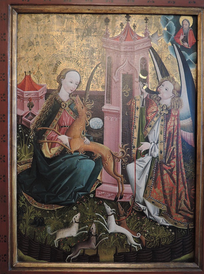 V pozdím středověku se nakrátko objevuje ještě specifické téma Zvěstování jako lov na jednorožce, které symbolizuje neposkvrněné početí Panny Marie. Námět se objevuje až do Tridentského koncilu, který ho již dále „nedoporučuje“. U nás se jedná o ojedinělý motiv. Krásným příkladem je Oltář z Jeníkova (kol 1460). Zkrocený jednorožec (symbol Krista ) spočívá v klíně Panny Marie. Archanděl Gabriel je zobrazen jako lovec troubící na roh se 4 psíky představující ctnosti: Pravdu (Veritas), Pokoj (Pax), Spravedlnost (Iustitia) a Milosrdenství (Misericordia). Netypické je umístění archanděla, většinou přichází k Marii zleva a zde je opak. V pravé horní části nám opět nechybí holubice Ducha svatého a Bůh Otec. Máme zde typické symboly čistoty a neposkvrněnosti:
